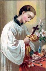 聖人在一五六八年出生於 意大利隆巴底貴族。 自幼受母親熱心教育, 非常傾向修會生活; 看破紅塵,把侯爵名位讓給弟弟; 然後往羅馬入耶穌會修道; 後在醫院服侍病人, 一五九一年染疫而歿。